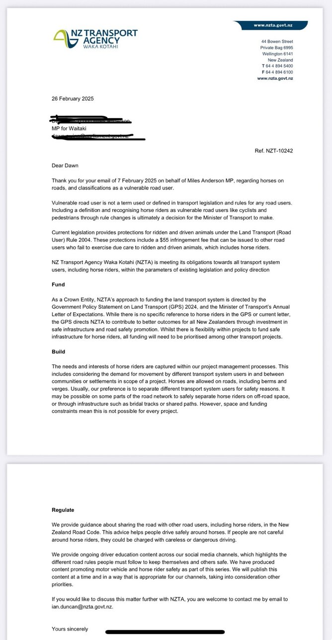 Waka Kotahi (NZTA) is meeting its obligations towards all transport system users, including horse riders, within the parameters of existing legislation and policy direction.