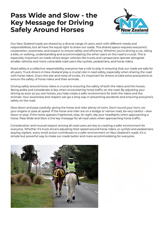 In 2024 NZ Trucking delivered again on behalf of community by including a two page write up in its October magazine. It was outstanding support shown to a group of road users that had been on the receiving end of little to no road safety education in community. The Pass Wide and Slow message, endorsed by NZ Police was supported by the trucking sector.