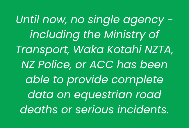 Never-before-seen fatality figures for the number of people killed while riding or driving a horse-drawn vehicle on New Zealand roads were tabled in Parliament by Trust Chair Julia McLean.